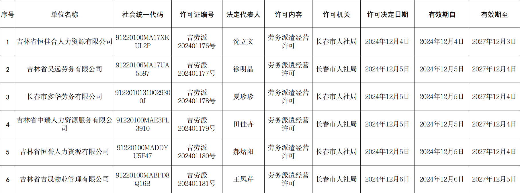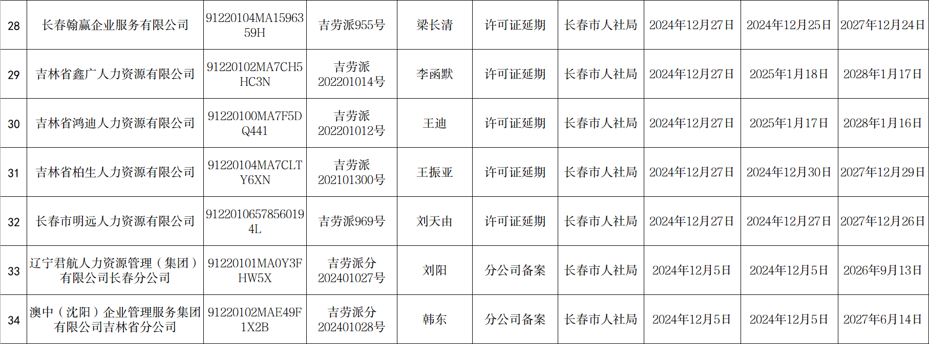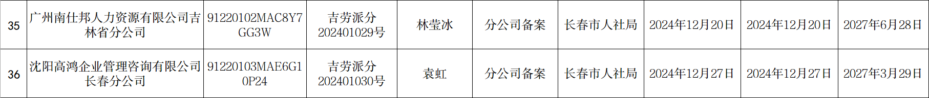 长春市劳务派遣经营许可单位新设立、延期、分公司备案信息公示(2024年12月2日至12月31日)