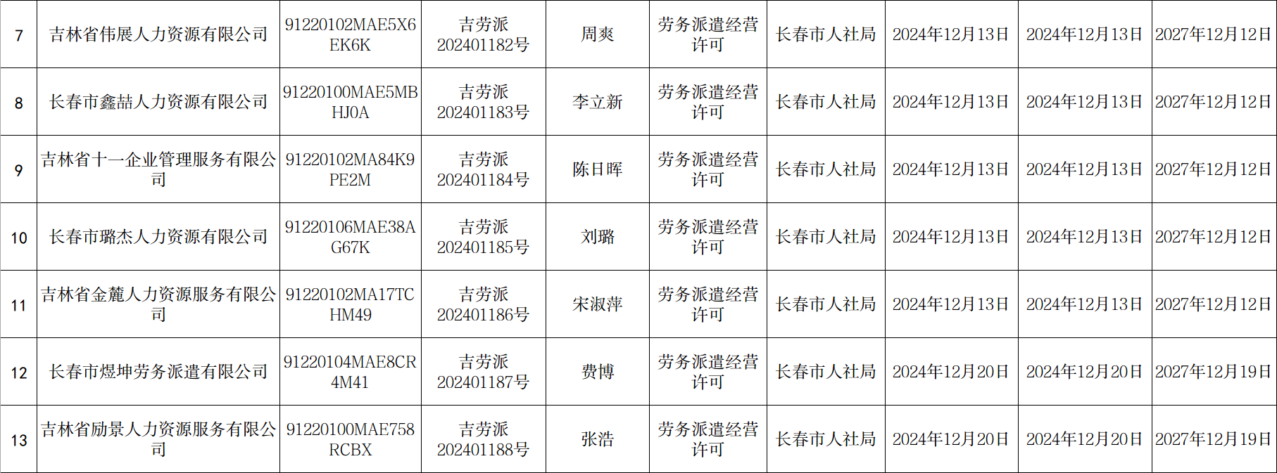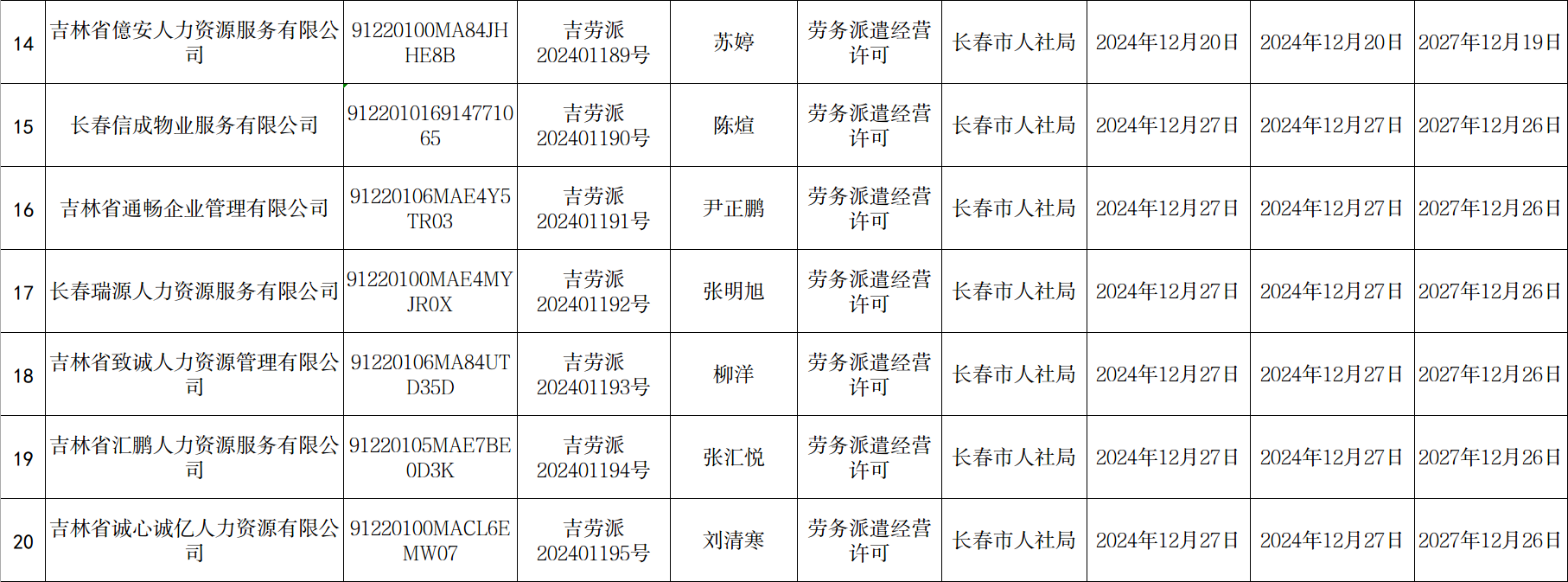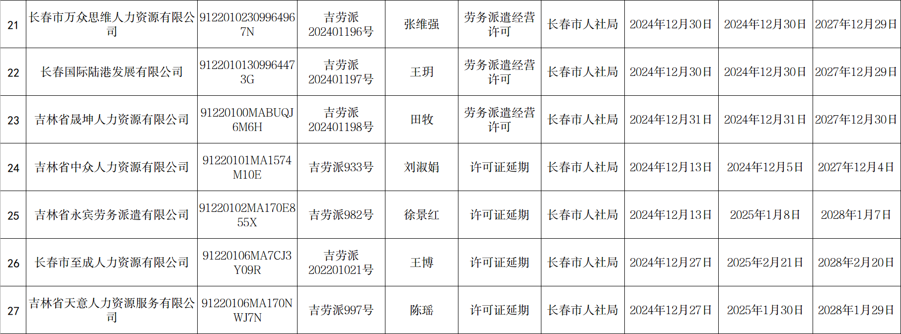 长春市劳务派遣经营许可单位新设立、延期、分公司备案信息公示(2024年12月2日至12月31日)